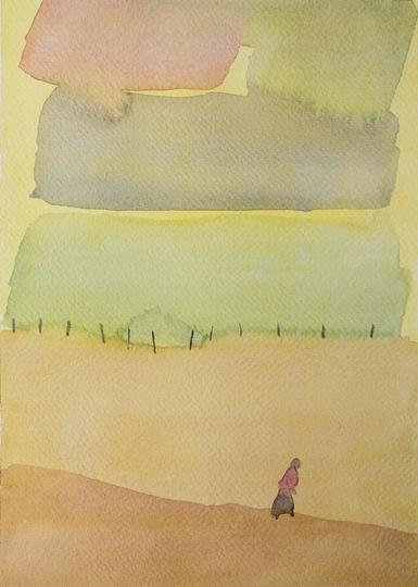 Illness in old age is always a transformation. Subhash has spent time near a lake in Bhor on the Western Ghats of Maharashtra. This plateau-esque terrain with valleys and a reservoir is stationary in time. Watercolours from here capture Awchat’s view of the Sky as blue. He sees homes dwarfed under the horizon of the Sun. His monk-like figures run under colourful buntings that have affinities of form with geometrical abstraction. We realise how he uses space in his canvases; a particular work divided the paper into a palette of pastels. He is not using ochre. Brown is not to be seen, instead, bright Yellows, Pinks and Light Blues fill spaces where he doesn’t find forms. A social person finally finds in the landscape a form to draw solitude.