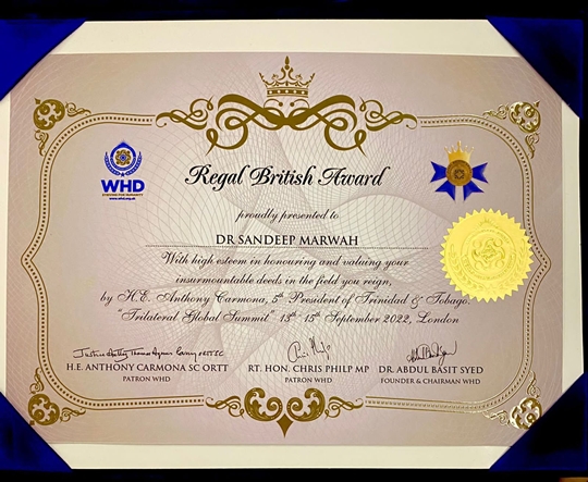 London: Yes..He’s back again in news, good news. The inimitable and indefatigable Dr Sandeep Marwah, President of the prestigious Marwah Studios, with nine international records was honoured the other day with most prestigious REGAL BRITISH AWARD by World Humanitarian Drive (WHD) at Royal Society of Arts in London under the Chairmanship of Abdul Basit Syed and patronship of RT Hon. Chris Philip, Member of British Parliament, for his untiring contribution to education, media and entertainment industry.
