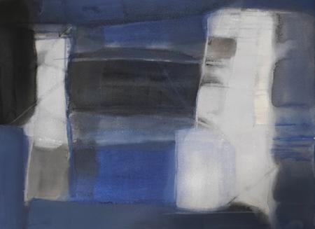 Vikas Malhara operates within a restrained, inward abstraction where form appears only as a trace and colour functions as a carrier of time. The paintings unfold slowly, built from translucent layers of greys, blues, blacks, and earthen whites, creating surfaces that feel weathered rather than composed. Nothing is declared outright; instead, structures emerge hesitantly, as if remembered rather than invented.