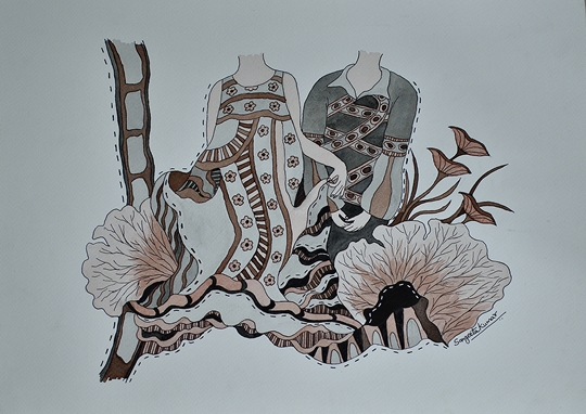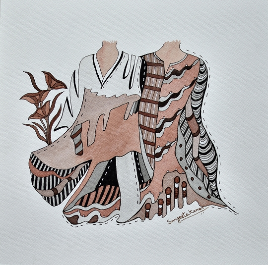 In Sangeeta’s latest series, ‘Life Witthin’, she has chosen the medium of pen and ink on paper and vibrant acrylic hues on canvas to create a visually appealing series of artworks. A noteworthy element of the series ‘Life Witthin’ is the beautiful depiction of fabrics. One can almost feel the texture and flow.Each of her works in the series retains a cohesive link to the central theme which is fluid curves and fine lines that balance each other. The artist’s paintings demonstrate her mastery over this genre which is a new addition to her already extensive portfolio.