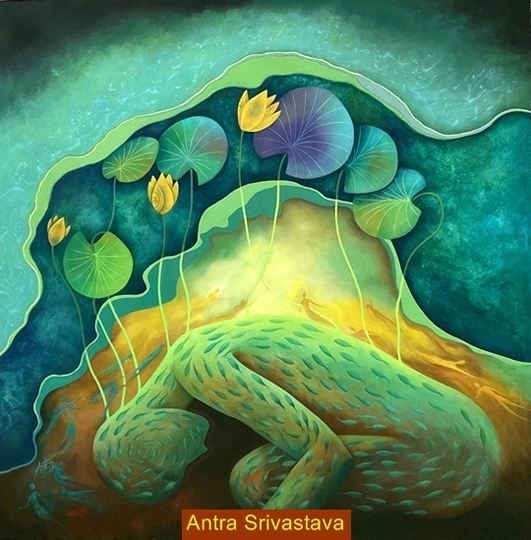 The enchantingly luminous water colour pieces by Gitanjali Shah, Mukta Kadam, Niyati Amlani and Shyam Karri combines the reflection of the white paper along with its texture exploiting the translucent tenderness of watercolour; the effect is wistful! Though Mukta Kadam do not fall in the temptation of using water colour’s qualities to boost its visual appeal but takes her artworks much more beyond merely what is overtly visible; they need multiple readings to dig deeper in her visual connotations. Artists Anjali Prabhakar, Antra Shrivastava, Bandana Kumari, Bhamini Sarda, Rajitha, Eshmeet Thapar, Jyoti Singh, Medha Nerurkar, Neerja Kujur, Preeti Shaw, Priya Kataria, Purnima Walunj, Riya Nahata, Sayed Bakar and Vinod Venkapalli visually communicate and symbolize fundamental truths of their subjects through the symbolic compositions.