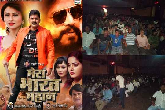 भोजपुरी फिल्मों के दो दिग्गज सुपरस्टार सांसद व मेगा स्टार रवि किशन और पावर स्टार पवन सिंह की रिलीज हुई बहुप्रतीक्षित फ़िल्म “मेरा भारत महान” बम्पर ओपेनिंग लेकर भोजपुरी बॉक्स ऑफिस पर धमाल मचा दिया है. पटना के बीना सिनेमा सहित कई सिनेमाघरों में हॉउसफुल का बोर्ड भी लगा. फ़िल्म के पहले शो में भोजपुरी फ़िल्म देखने वाले दर्शको को भाड़ी हुजूम देखने को मिला. सिनेमा हॉल के बाहर दर्शक तपती धूम में फ़िल्म देखने के लिए कतार में खड़े दिख रहे थे, वहीं सिनेमा हॉल के अंदर फ़िल्म के एक एक सीन और गाने पर दर्शक खूब सीटियां और तालियां बजा रहे थे.