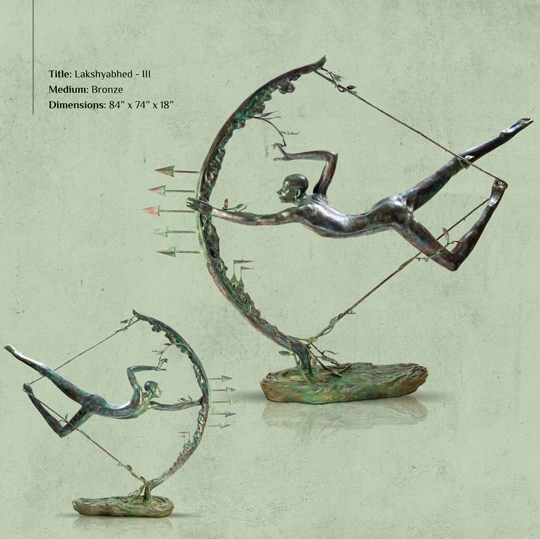 Actually the human aspirations as Asish’s thematic concern, are also implied in several sculptures in which the human figure is sometimes associated with a bird, thus a bird like form with long beak is attached around the waist of a man (see ‘The Royal Flight’). Or the man is attempting to fly like a bird, thus he rises on his toes, giving an agile stance to the rising figure. A pair of small metal wings is attached to the shoulders (see ‘The Feminine Upthrust’ ). Alternatively a large pair of wings, shaped in wood planks is hinged with the bronze casted upper back, giving an impression of powerful wings (see ‘The Blissful Draught’ ) . Here we may also draw attention to Asish’s amazing sensitivity of ‘detailing’ such as an exquisite small bird motif with spread out wings, which are delineated on the human torso and the limbs and given buffed polish, so that they shine like gold, amidst the contrasting greenish colour of the patina. In the “ Vanquishing Thought – II”, the figure stands on the toe of left leg with raised right leg, as if the figure is already air-borne. The spread out arms have the gesture of releasing an arrow from the bow. A thin metal sheet covers part of the groin in the front and spreads behind the back as a foil. This metal sheet is perforated with cut outs of the same bird form in fine contours, creating a pleasant contrast with the glittering bird forms on the body. No doubt to render these motifs with finesse requires special skills, which the sculptor has inherited from the fact that he belongs to a family of jewellers. At the same time, this design motif of the soaring bird has a creative purpose which is metaphorical.