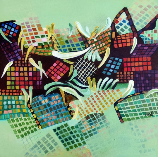 Divya Kher – She is based in Bangalore. Her works are the odes to the rural culture with an emotional charge. She has revealed simplicity of this subject in her work through happiness while dancing, talking with birds and nature with a village setting in the background. She has used vibrant and contrasting colours for painting the forehead of figures and their clothes symbolizing innocence, calmness and tranquillity. She had her art education up to M.A. in arts at Kamala Raja Girls Post Graduate College, Jiwaji University, Gwalior and Ph.D. in visual fine arts also.Her Ph.D. was nomadic block prints of Gujarat also known as “Mata ni Pachedi “. She has participated in several on line & off line shows and got good response for her work.