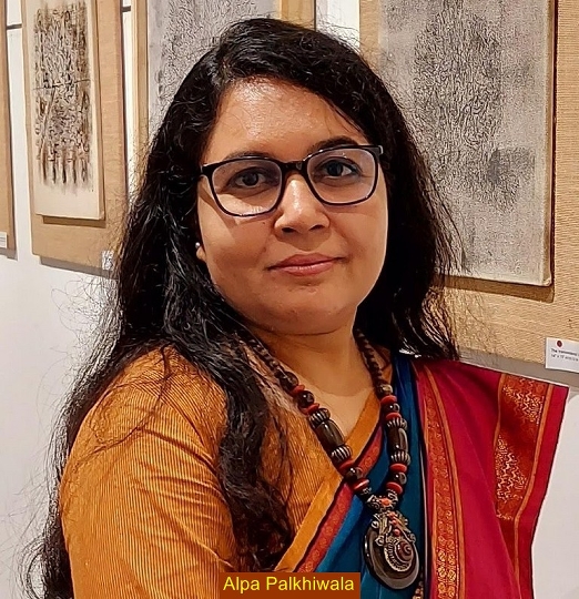 Alpa Palkhiwala – Based in Ahmedabad, Alpa Palkhiwala had her art education in fine arts and art history. She has shown her work in solo art shows earlier at Mumbai, Bhopal, Noida, Kolkata and Chicago – USA. Her work has been inspired by spiritual art through pairing of mind, body and breath, thereby rendering soul energy and peace. She has illuminated this energy in the art work with layering of earthy colours. She has also illustrated spiritual thematic peculiarity in her Transcendental Universe series using dark hues of black and grey created on canvas with acrylic colours and ink to achieve the finishing similar to etching. Her work has been widely appreciated by the art world in the earlier shows. A deep study of Indian Mythology and Jain Manuscripts and other literature find a prominent place in her present creative endeavours. She has received some guidance from Shri. Vrindavan Solanki – a veteran artist of the past era and incorporated salient features of the same in her latest series.